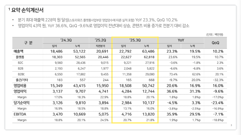 • 3분기 매출 228억으로 분기 최대 실적, 플랫폼 매출 중심 구조로 안정적인 우상향 지속
