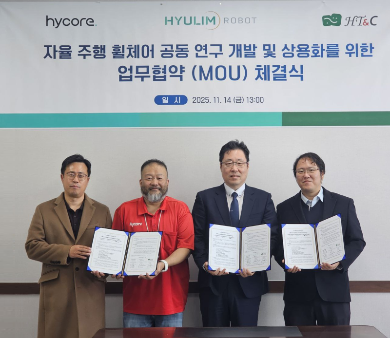 휴림로봇은 하이코어·에이치티엔씨와 함께 자율주행 휠체어 상용화를 위한 전략적 업무협약(MOU)을 체결했다고 17일 밝혔다. 3사는 급증하는 고령화와 의료 현장의 이동 보조 수요에 대응해 제품 개발부터 인증, 시장 확대까지 전 과정을 공동 추진하기로 했다.