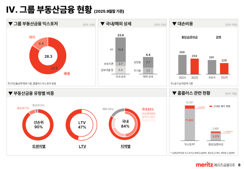 • 25년 3분기말 그룹 부동산 익스포저는 28.3조원이며 국내 23.9조원, 해외 4.4조원 구성