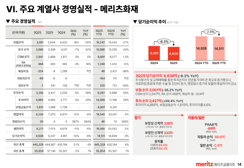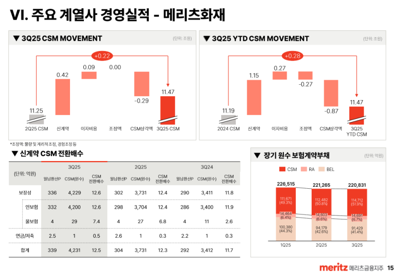 • 25년 3분기말 CSM 규모는 11조 4,711억원으로 전분기 대비 약 2,229억원 증가