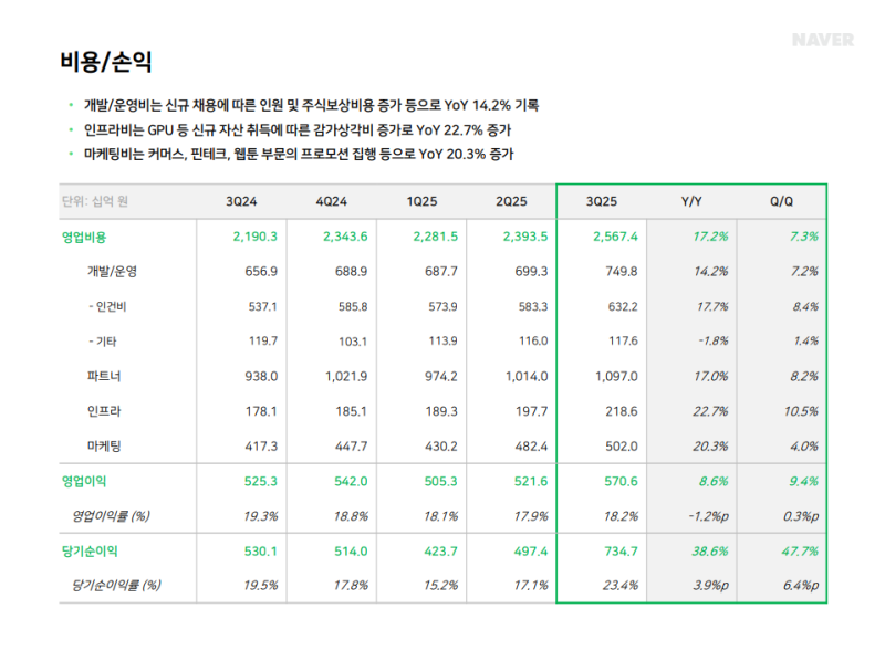 • 개발·운영비는 신규 채용에 따른 인건비 및 주식보상비 증가로 전년 동기 대비 +14.2% 증가