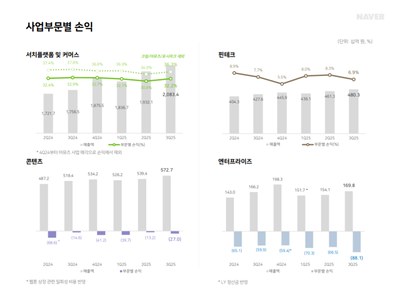 • 서치플랫폼 및 커머스 통합 부문은 견조한 매출 성장에도 AI 접목 및 쇼핑 프로모션 비용 영향으로 전년 동기 대비 이익률이 소폭 하락하였으나 30% 이상의 안정적 이익률 유지