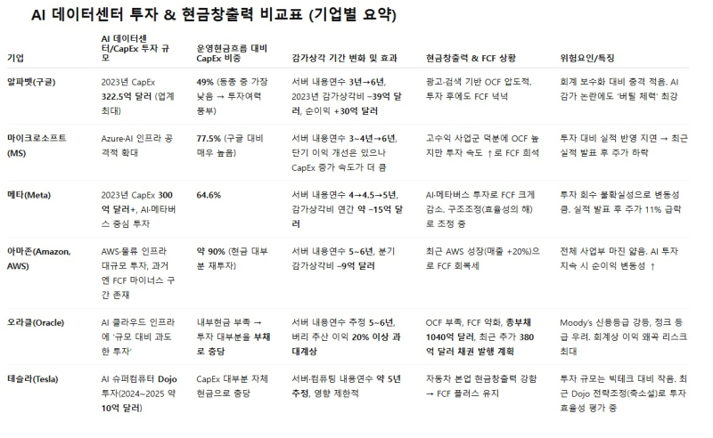 ◆주요 기업별 분석: AI 데이터센터 투자 현황과 현금창출력미국 내 주요 기업들이 어떻게 AI 데이터센터에 투자하고 있고, 재무적으로 어떤 위치에 있는지 살펴봐야 한다. 특히 자체 현금창출력으로 투자를 감당할 수 있는지와 감가상각 정책 변화의 영향을 기업별로 따져봐야 한다.