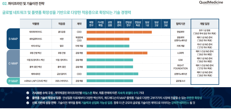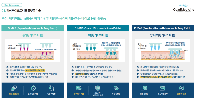 쿼드메디슨은 S-MAP·C-MAP·P-MAP으로 구성된 3대 플랫폼을 중심으로 기술 포트폴리오를 구축했다. 분리형인 S-MAP은 니들 팁이 피부 투여 시 지지체와 분리되는 구조로 쿼드메디슨이 세계 최초로 개발한 기술이다. 약물의 전달 효율과 편의성을 고려한 설계가 특징이다.