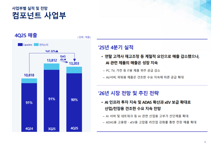 • MLCC 부문 타이트한 수급 상황 속에서 선제 확보한 산업/전장용 캐파를 활용해 AI 서버 및 ADAS용 대형 고용량 제품 수요 적극 대응
