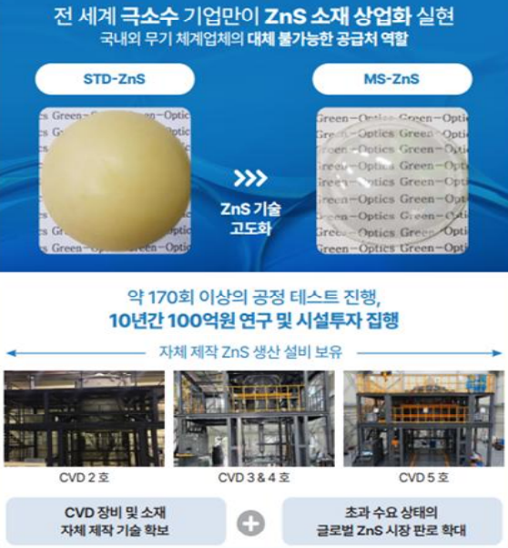 그린광학 관계자는 “ZnS 개발을 위한 소재와 장비는 모두 전략 물자로 분류된다”며 “한국 뿐 아니라 대부분의 국가 역시 이를 전략 물자로 지정하고 있기에, ZnS 관련 수요는 공급을 항상 초과하고 있다”고 전했다.
