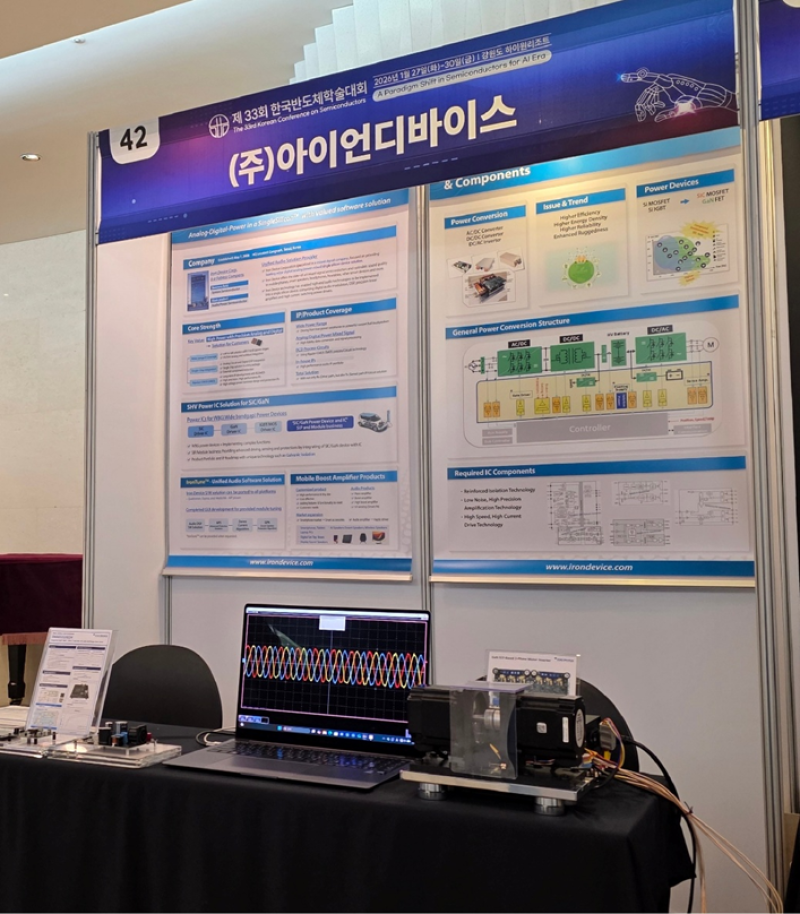 반도체 팹리스 전문기업 아이언디바이스가 27일부터 30일까지 열리는 ‘제33회 한국반도체학술대회(KCS 2026)’에 참가해 질화갈륨(GaN) 소자를 적용한 고성능 ‘3상 모터 인버터’ 시스템 기술을 선보이며 휴머노이드 로봇 및 모빌리티 시장 공략에 나섰다.