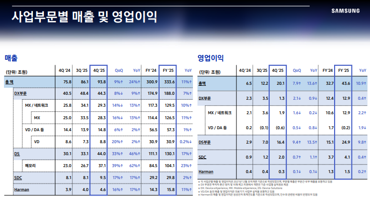 • DS 부문은 HBM 등 고부가 메모리 제품 판매 확대와 메모리 시장 가격 상승 영향으로 매출이 전분기 대비 33% 증가