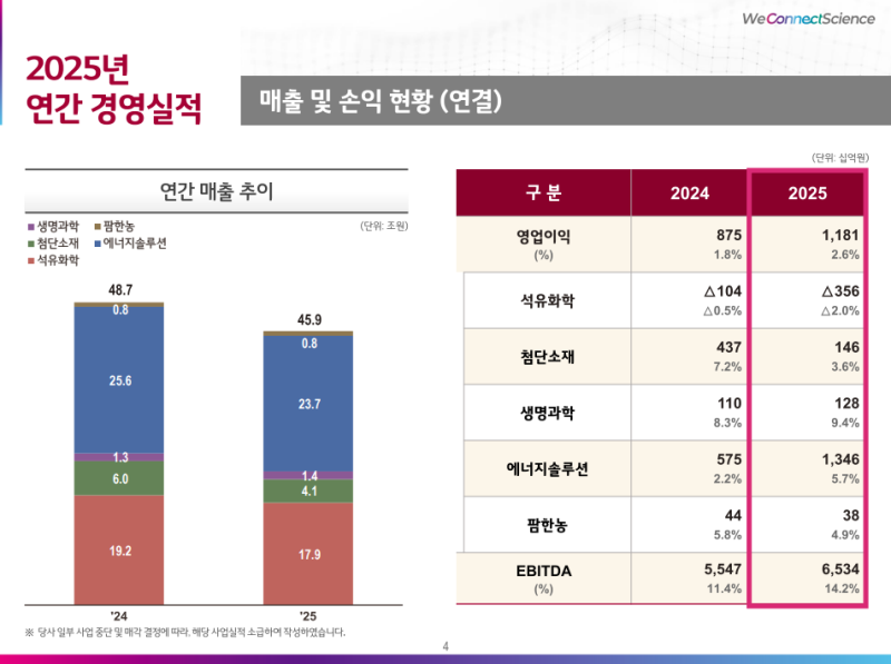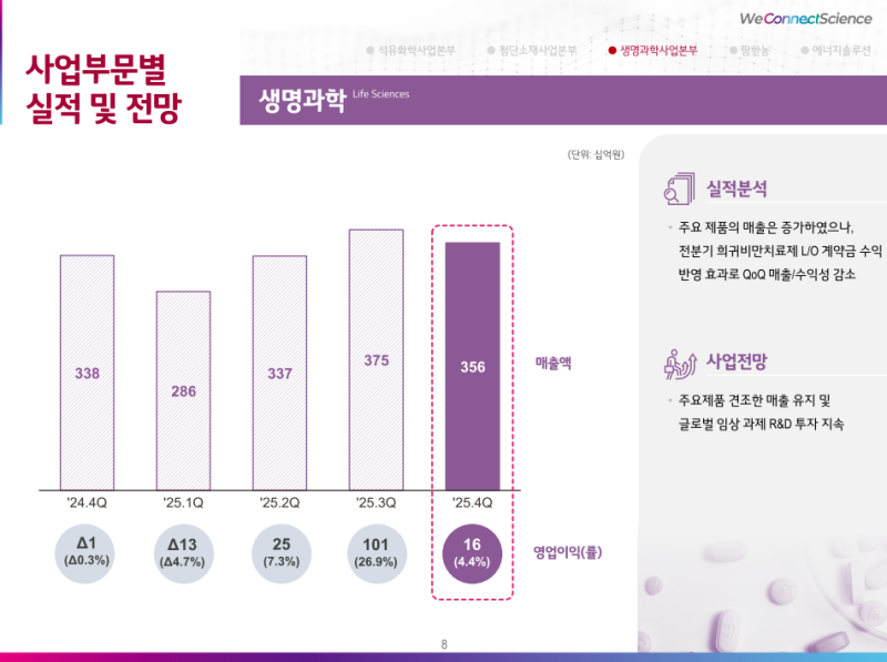 • 생명과학 부문은 4Q25 매출 3,560억 원, 영업이익 160억 원 기록