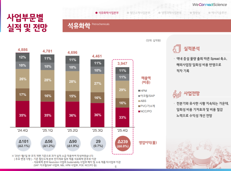 • 석유화학 부문은 4Q25 매출 3조 9,470억 원, 영업손실 2,390억 원 기록