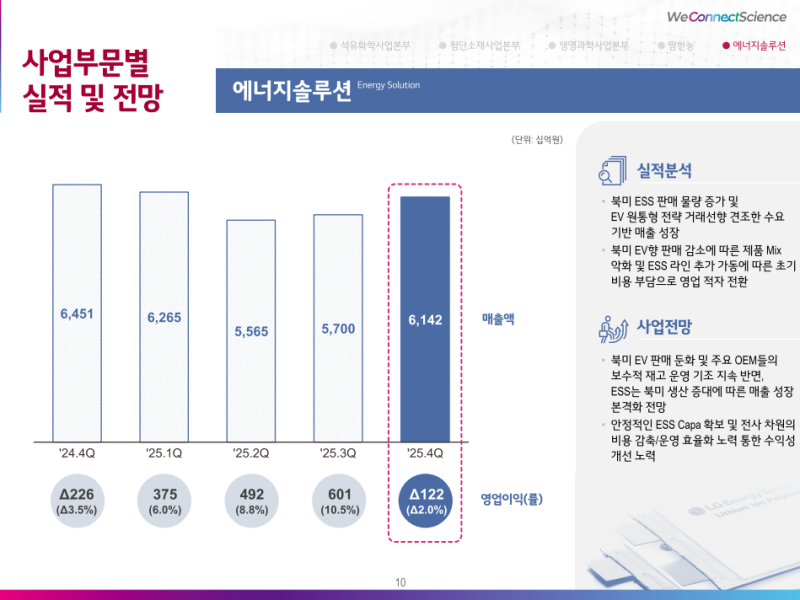 • 에너지솔루션 부문은 4Q25 매출 6조 1,420억 원, 영업손실 1,220억 원 기록