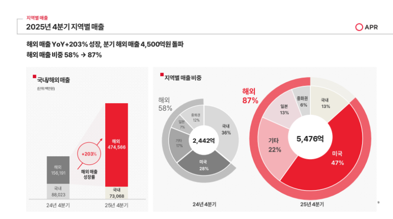 • 2025년 4분기 해외 매출은 전년 동기 대비 203% 성장한 4,746억 원 기록(YoY +203%)