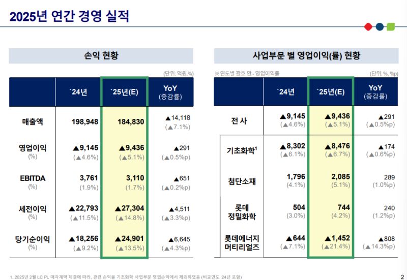 • 2025년 매출액은 전년 대비 7.1% 감소한 18조 4,830억 원을 기록하였으며 영업손실은 9,436억 원을 기록함