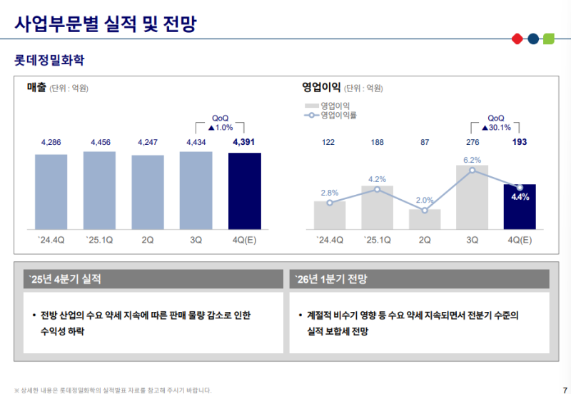 • 연말 고객사 재고 조정 및 계절적 비수기 진입 영향으로 판매량이 감소하며 전분기 대비 수익성 하락