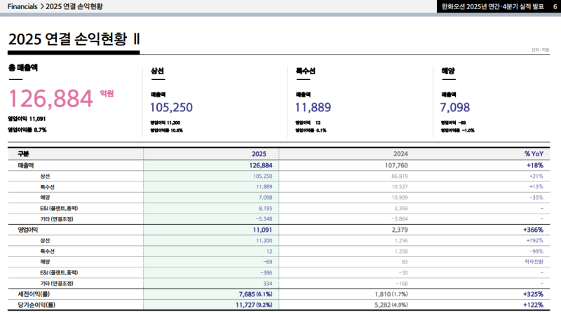 • 2025년 매출 12조 6,884억 원(YoY +18%), 영업이익 1조 1,091억 원(YoY +366%) 기록