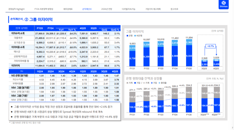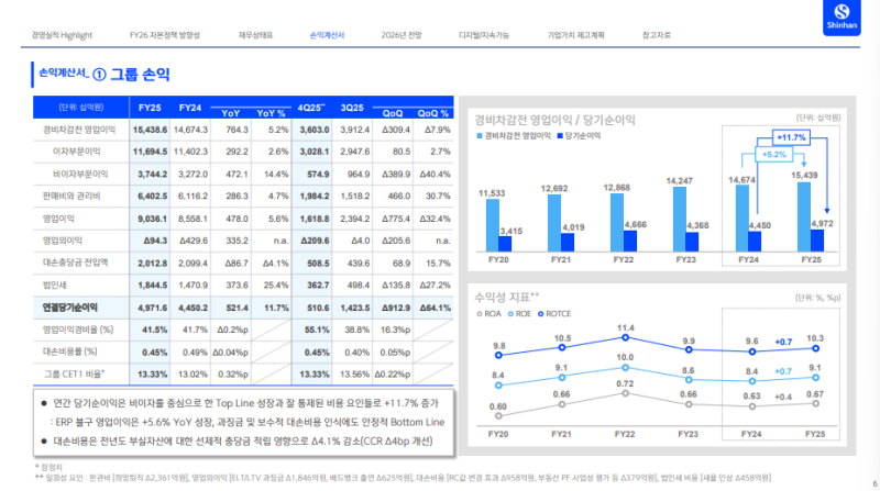 • 2025년 연간 당기순이익 4조 9,716억 원(YoY +11.7%), 비이자 중심 Top Line 성장 및 비용 통제 요인 기반 시현