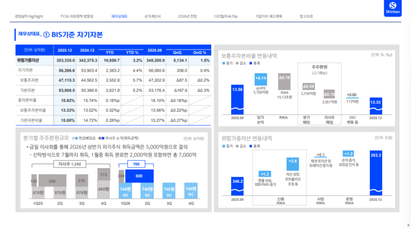 • 2025년 말 기준 그룹 CET1 비율 13.33% 잠정 집계, 환율 상승에도 불구하고 그룹 RWA 계획 범위 내 관리