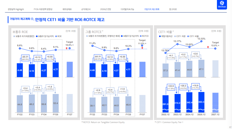 • ROE 10% 달성을 위해 26년과 27년 당기순이익을 최소 연평균 10% 이상 성장시키는 계획 수립