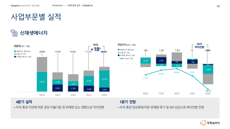 • 영업이익 -4,783억 원(QoQ 적자지속, YoY 적자전환), 신재생에너지 부문 수익성 악화 영향
