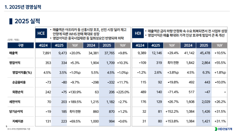 • HD현대인프라코어 매출액: 4조 5,478억 원 (YoY +10.5%)
