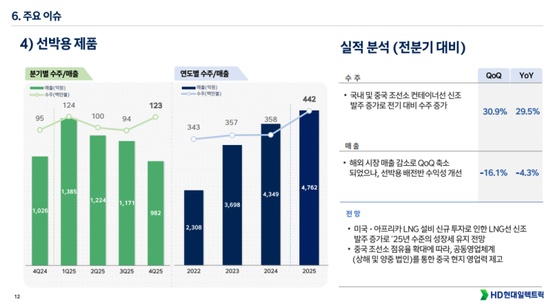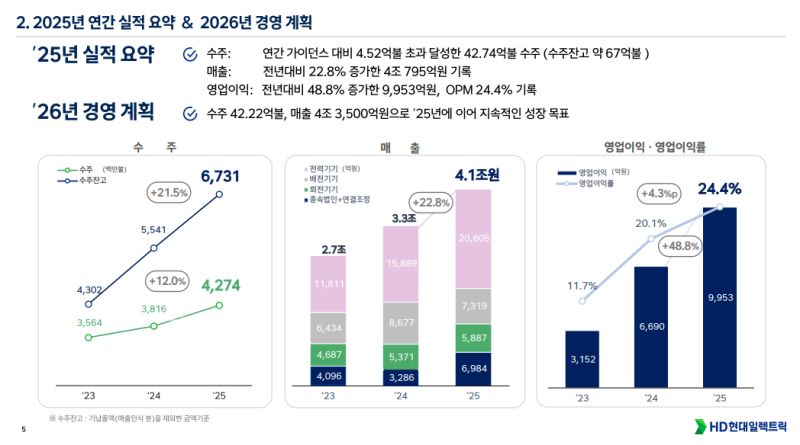 • 4Q25 말 수주잔고 67억 3,100만 달러로 YoY +21.5%, 2026년 매출 4조 3,500억 원 가이던스 제시