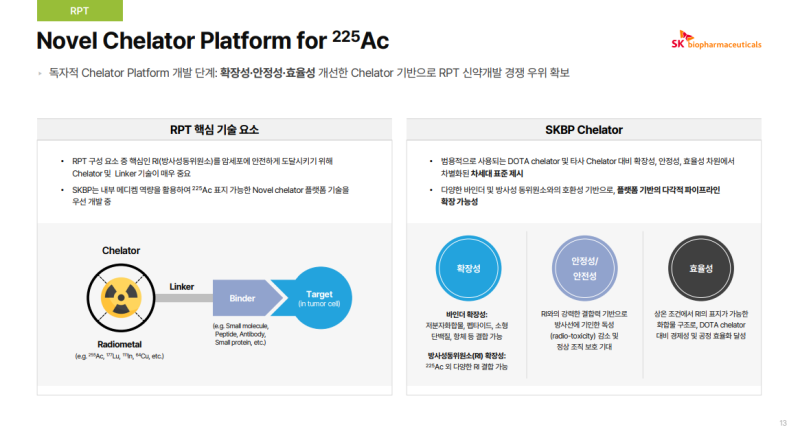 • SK바이오팜은 30년간 축적된 Medicinal Chemistry 역량을 기반으로 225Ac 표지가 가능한 Novel Chelator Platform을 자체적으로 개발하고 있으며 단순 자산 단위 기술이 아닌 RPT 전반에 적용 가능한 플랫폼 기술을 구축하는 단계