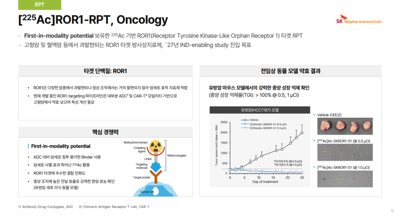 • 임상 단계의 SKL35501, 전임상 단계의 SKL37321, First-in-modality potential 보유 [225Ac] ROR1-RPT 등 차별화된 RPT 파이프라인 확보