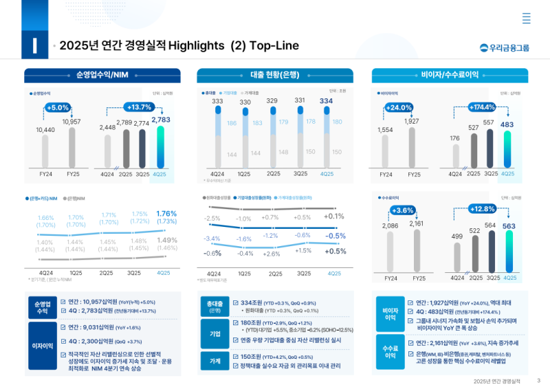• 비이자이익 1조 9,266억 원으로 YoY +24.0%, 역대 최대 수수료이익과 유가증권·외환·보험 손익 고른 성장 반영
