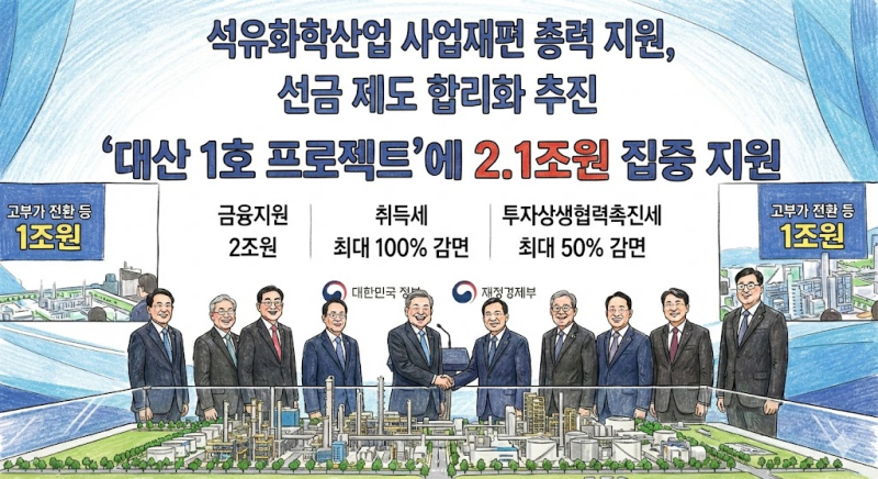 정부가 국내 석유화학산업의 근본적인 체질 개선을 위해 '대산 1호 프로젝트'에 총 2조1000억원 규모의 금융 지원과 파격적인 세제 혜택을 집중 투입하기로 했다.