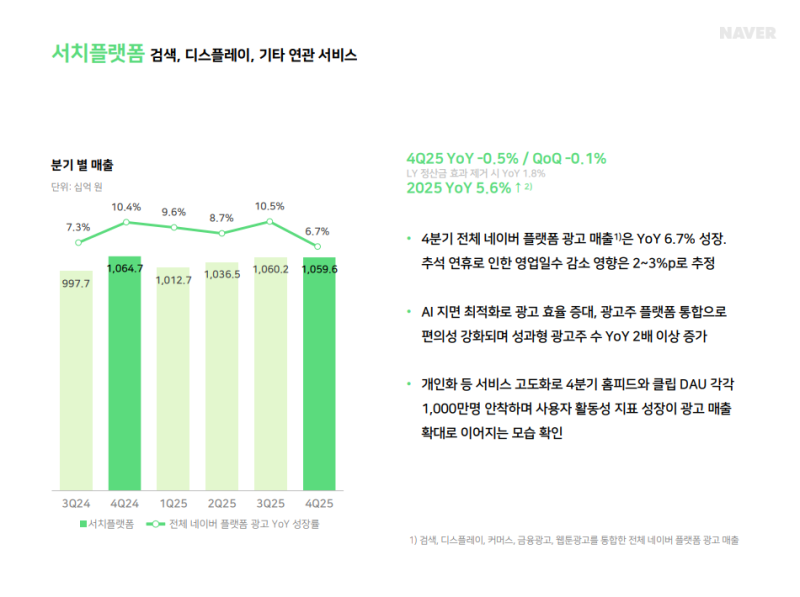 • 4Q25 전체 네이버 플랫폼 광고 매출은 10월 추석 연휴에 따른 영업일수 감소 영향에도 AI 기반 최적화·자동화 영향으로 광고 효율이 개선되며(YoY +6.7%) 성장