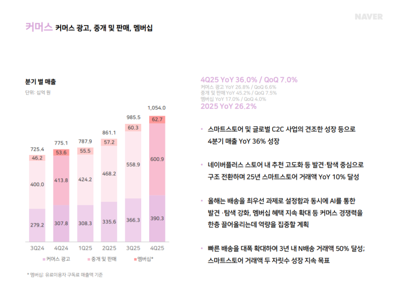 • 4Q25 커머스 매출 1조 540억 원(YoY +36.0%), 연간 3조 6,884억 원(YoY +26.2%)