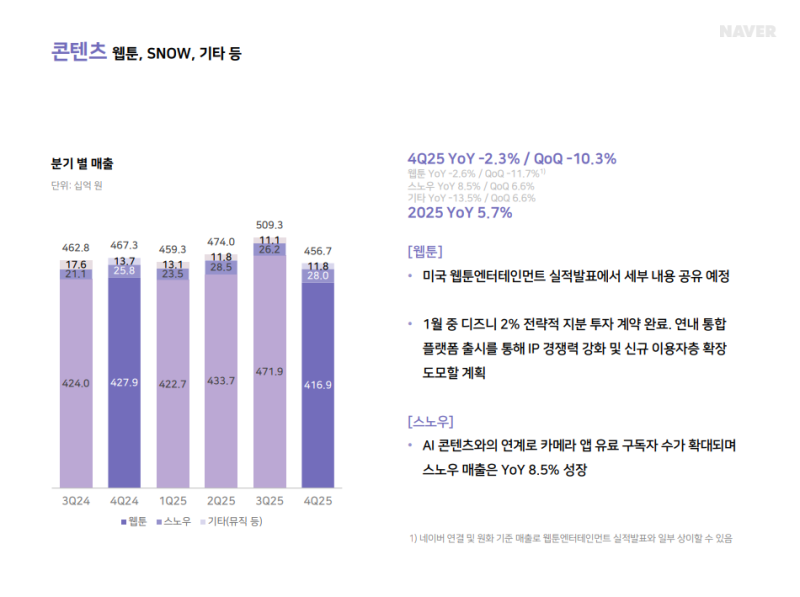 • 웹툰은 원화 기준 네이버 연결 실적 기준으로 4Q25(YoY -2.6%) 기록