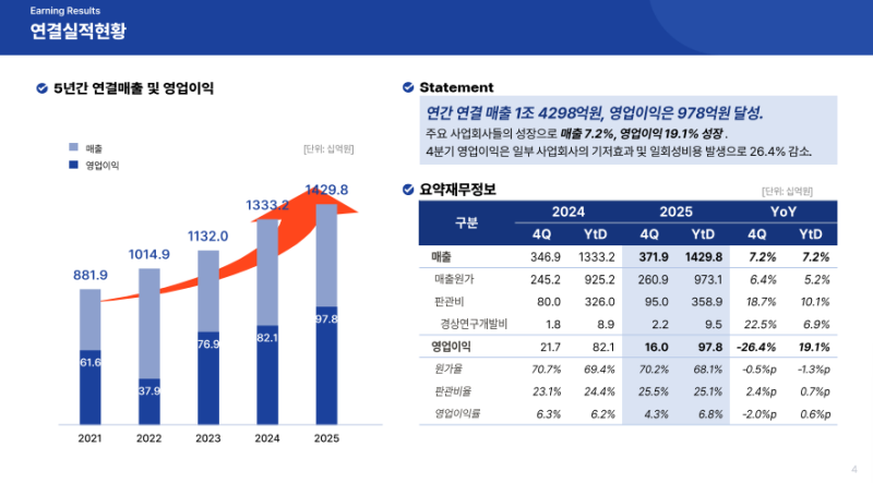 • 2025년 연결 매출 1조 4,298억 원, 영업이익 978억 원으로 각각 7.2%, 19.1% 성장하며 외형과 수익성 동반 개선