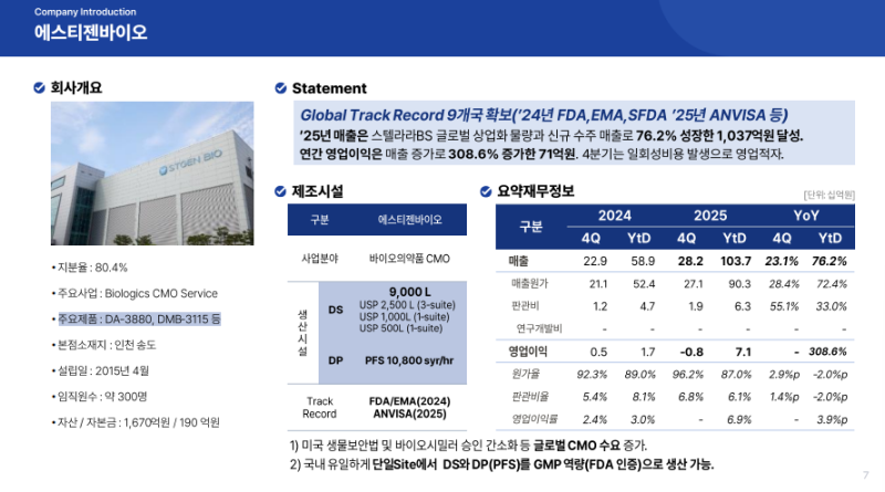 • 2025년 매출 1,037억 원으로 스텔라라 바이오시밀러 이뮬도사 상업화 물량 및 신규 수주 확대 영향으로 76.2% 증가