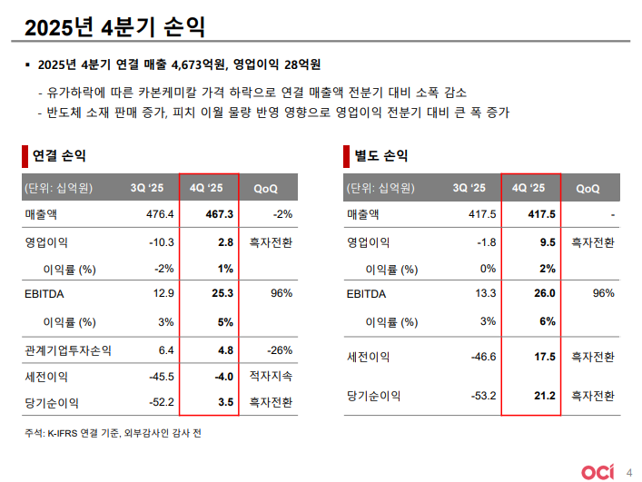 • 4Q25 연결 기준 매출 4,673억 원, 영업이익 28억 원으로 흑자 전환