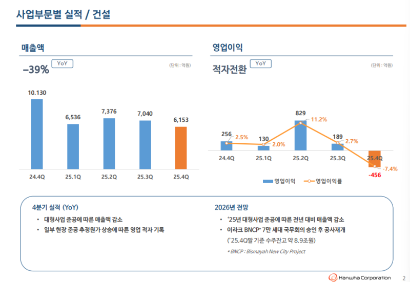 • 2026년 대형 사업 순차적 준공 영향으로 매출 전년 대비 감소 전망