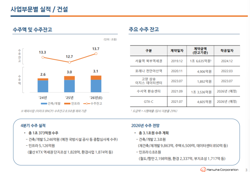 • 4Q25 수주: 1조 373억 원, 건축·개발 5,246억 원 및 인프라 5,126억 원 구성
