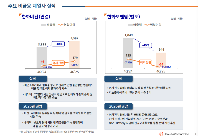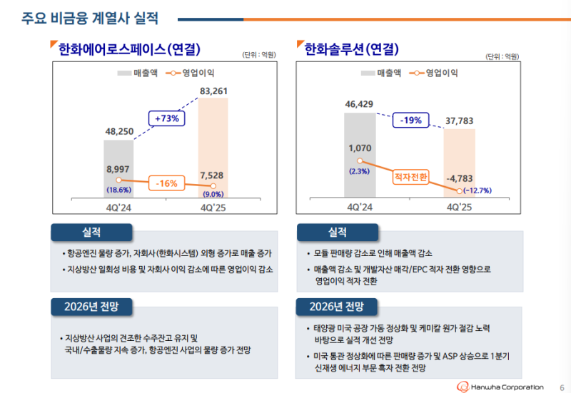 • 2026년 비금융 부문 한화에어로스페이스 지상 방산 및 항공 엔진 사업, 한화오션 상선 사업 중심 견조한 성장 전망