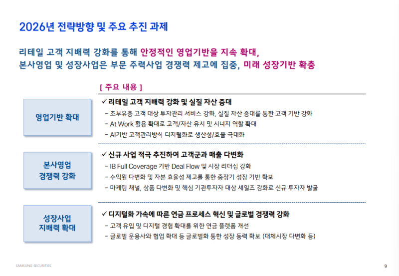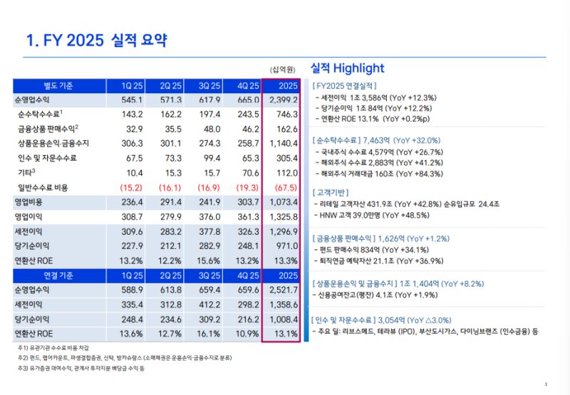 • HNWI 고객수(자산 1억 원 이상 고객): 2024년 4Q 26.2만 명 → 2025년 4Q 39.0만 명으로 증가하며 고액자산가 고객 기반 확대