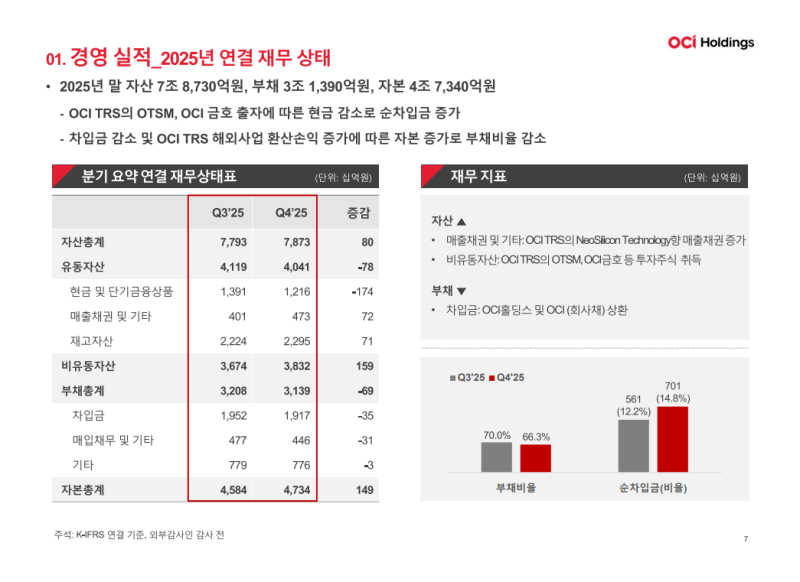 • OCI TerraSus(TRS) OTSM 프로젝트 출자와 OCI금호 합작법인 출자 진행되며 현금 감소와 함께 순차입금 증가