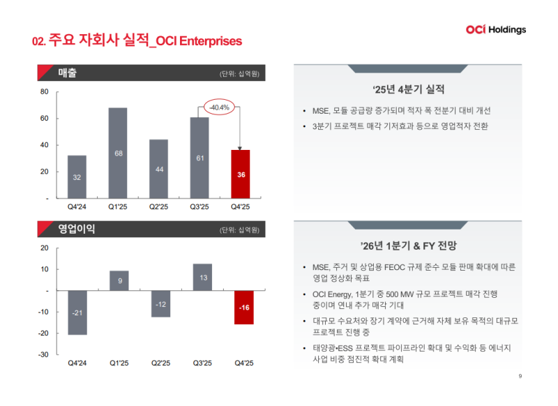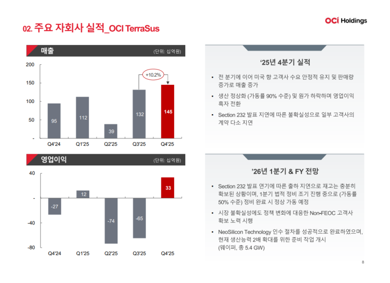 • 다만 4Q25 연결 기준 매출 약 8,110억 원, 영업이익 약 270억 원으로 흑자 전환했고 핵심 배경도 OCI TerraSus 생산 정상화와 제조원가 하락