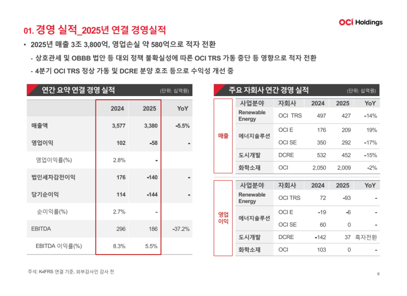 • OCI TerraSus(TRS) 가동 중단 영향이 2025년 연간 실적 적자 전환의 가장 큰 요인