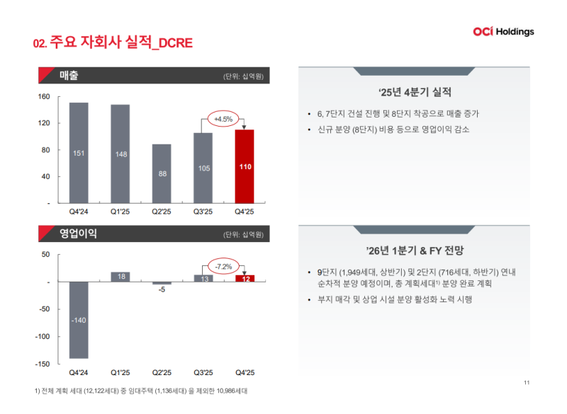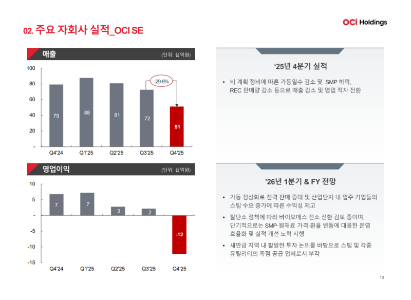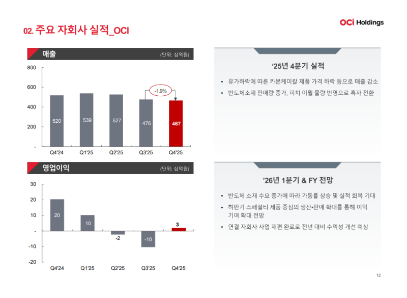 • OCI 사업회사는 화학 업황 부진에도 반도체 소재 판매 증가와 피치오일 물량 확대로 4Q25 흑자 전환
