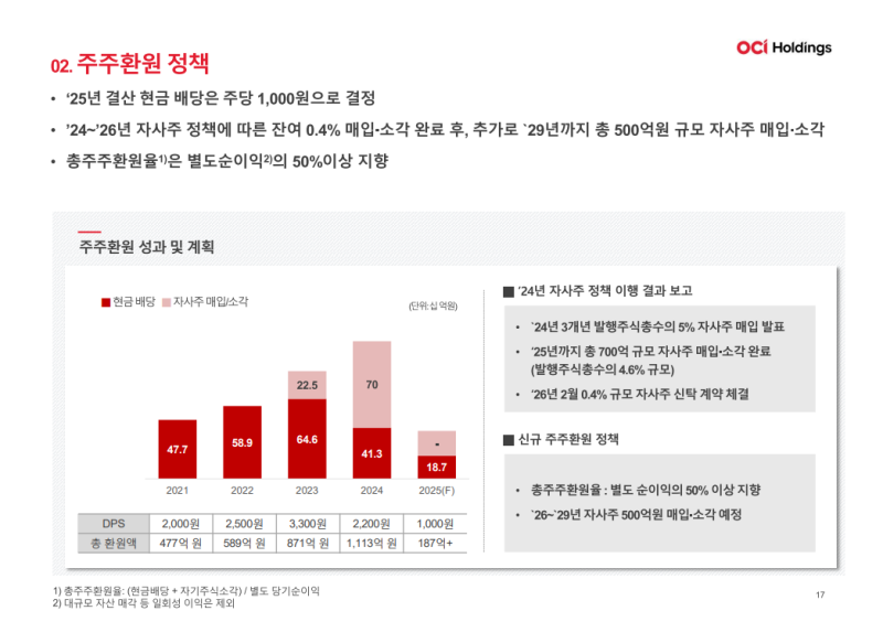• 회사는 현금배당과 자사주 소각을 합산한 총주주환원율을 별도 당기순이익 기준 50% 이상으로 유지할 계획 제시