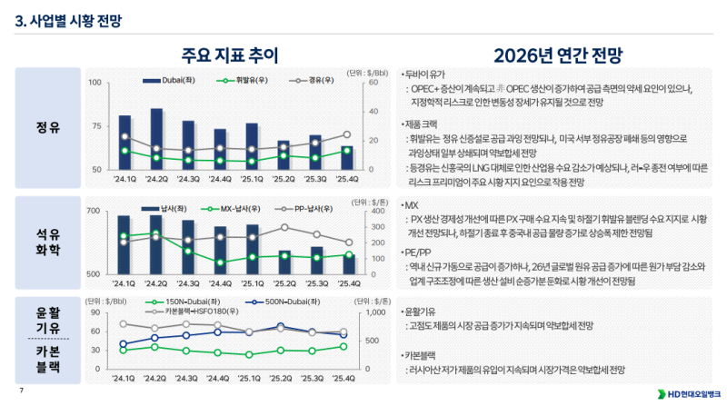 • 윤활유 및 석유화학 부문은 원유 공급 확대에 따른 원가 부담 완화와 업계 구조조정 영향으로 점진적인 시황 및 이익 개선 기대