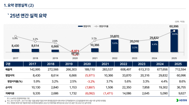• 2025년 연결 기준 영업이익 6조 996억 원 기록 (YoY +104.5%), 영업이익률 8.6%