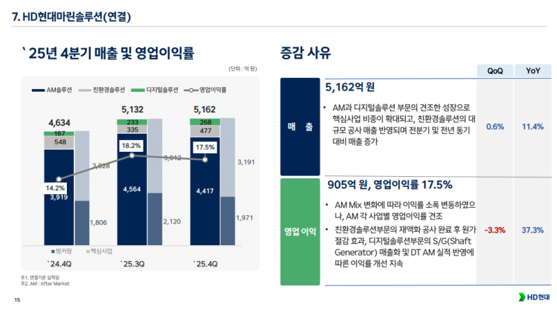 • HD현대마린솔루션 연결 매출 5,162억 원, 영업이익 905억 원 기록, 영업이익률 17.5%