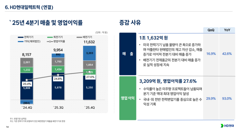 • HD현대일렉트릭 4Q25 영업이익 3,209억 원 (QoQ +29.9%, YoY +93%)으로 미주 전력기기 수요 확대와 고수익 프로젝트 영향으로 분기 최대 이익 기록