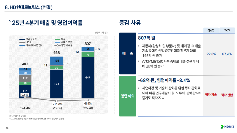 • HD현대로보틱스 연결 매출 807억 원, 영업손실 68억 원 기록, 영업이익률 -8.4%