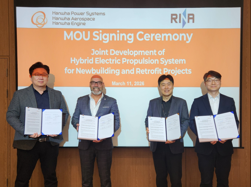 13일 한화그룹에 따르면, 한화파워시스템·한화에어로스페이스·한화엔진은 지난 11일 한화파워시스템 부산 사무소에서 이탈리아 선급 RINA와 '배터리 하이브리드 추진 선박' 개발 MOU를 체결했다.
